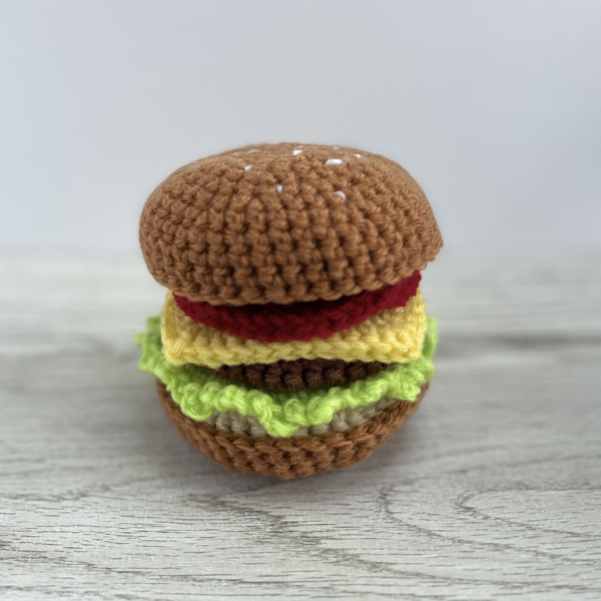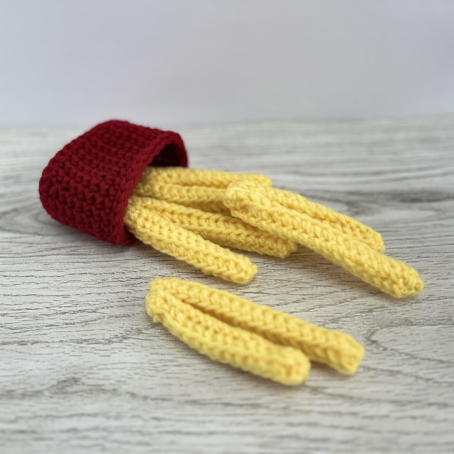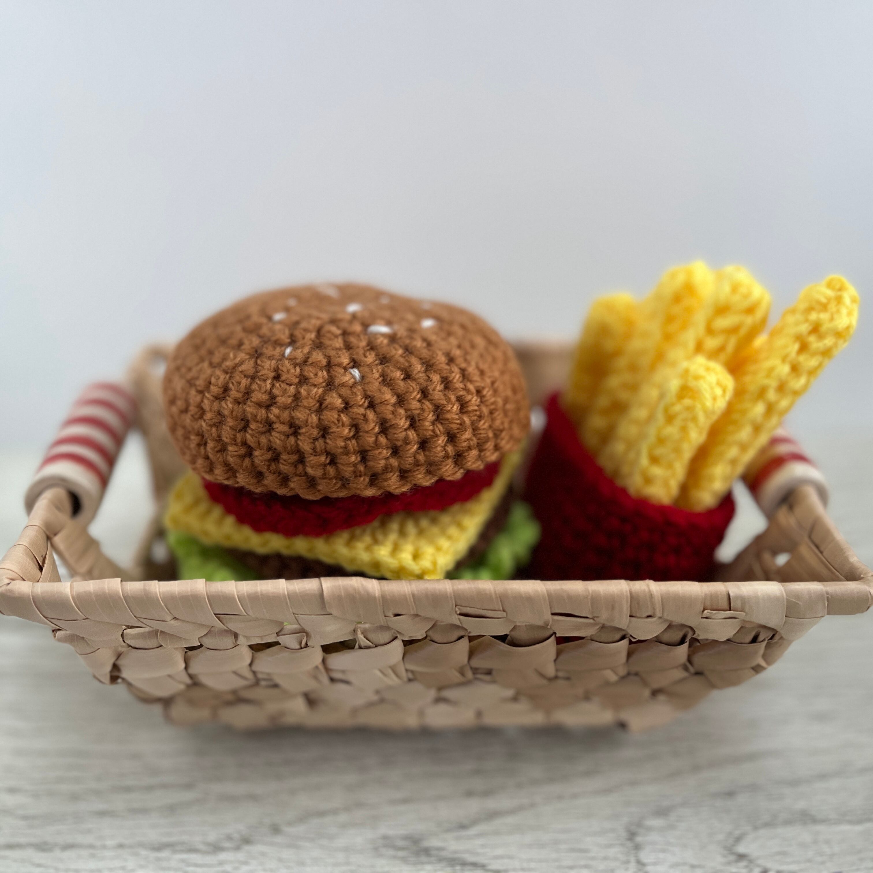 抗菌仕様のアクリル毛糸で作ったハンバーガーとポテトのおままごとセットです。